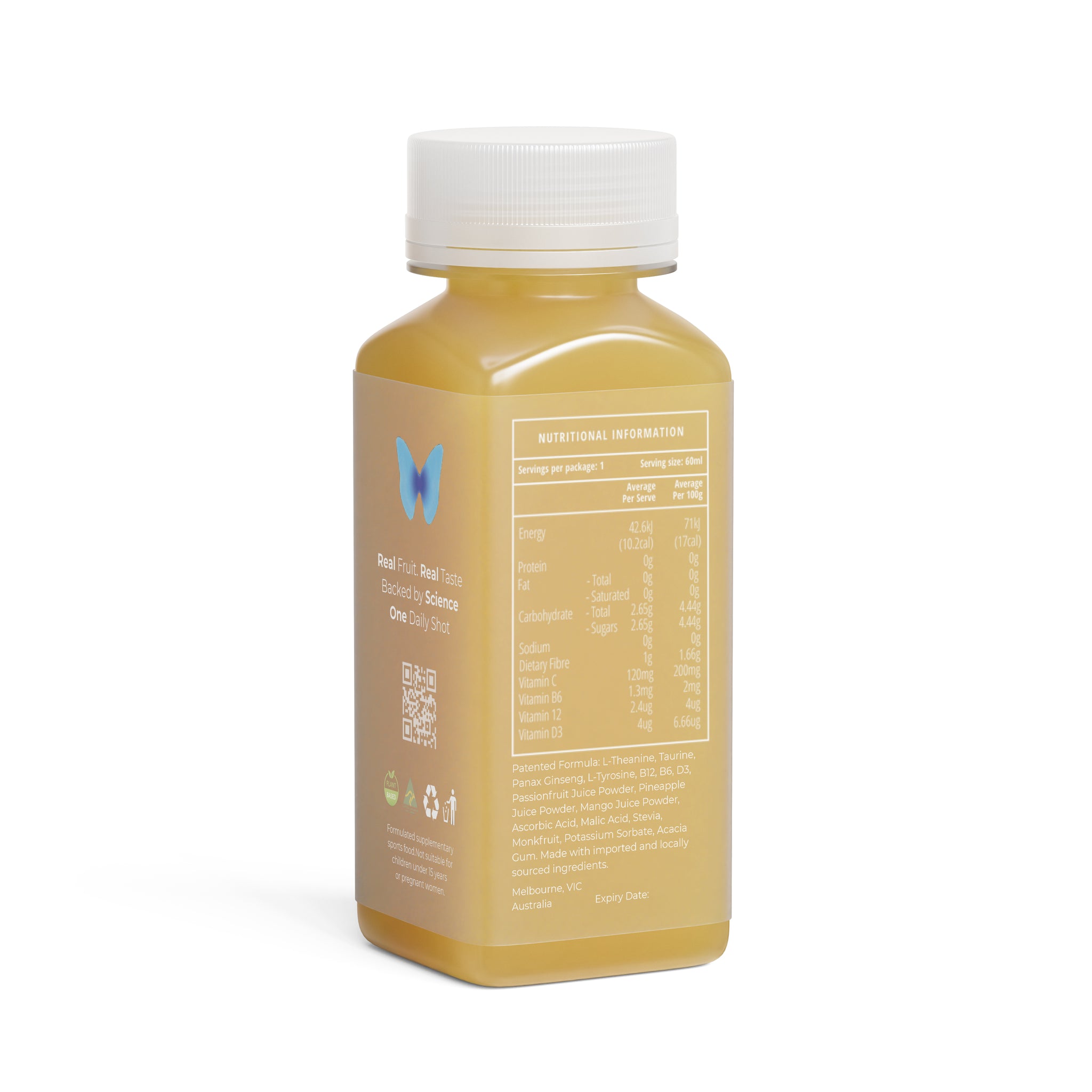 It all starts with one small shot. A clean daily upgrade for your mind and mood, powered by 7 functional ingredients including nootropics and adaptogens. Designed to support focus, calm, and energy without the caffeine rollercoaster. No crash. No compromise. Just 60ml of feel good focus to fuel your day.